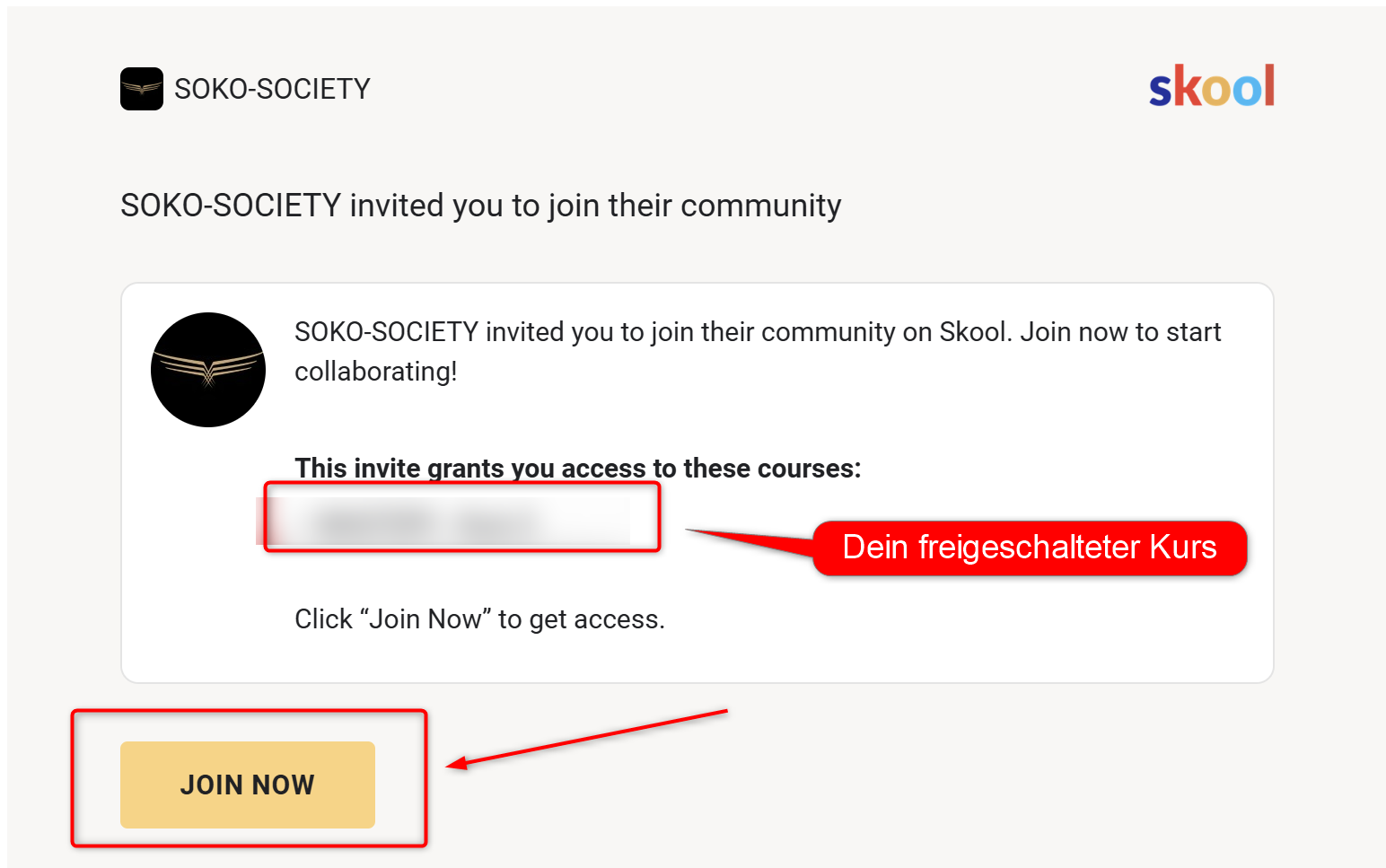Der nächste Kurs aus deinem gewählten Online-Praxis-Training (OPT) wurde für dich im Classroom freigeschaltet. In diesem Zusammenhang hast du soeben von Skool eine Mail mit dem Betreff: „SOKO-SOCIETY invited you to join their community“ bekommen.
